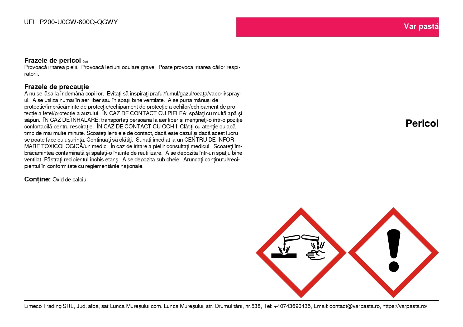 - Compozitie: oxid de calciu (CaO), apa